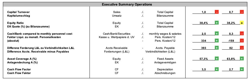 In einem ersten Termin übernehmen und besprechen wir Ihre Daten (Bilanz und GuV aus zurückliegenden Perioden, i.d.R. bis zu sechs). Diese analysieren und bewerten wir anschließend im Detail. Die Betrachtung erfolgt dann aus folgenden Perspektiven: