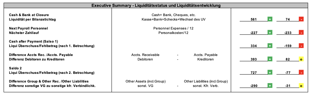 Bei einem zweiten Termin erläutern wir Ihnen die Ergebnisse. Für jeden der oben genannten Bereiche erhalten Sie eine kennzahlenbasierte Auswertung inklusive einer übersichtlichen Kommentierung der Ergebnisse in Form eines Ampelsystems und ergänzenden Anmerkungen. Die Besprechung enthält zudem konkrete Hinweise, welche Schritte erforderlich sind und wie diese umgesetzt werden können.