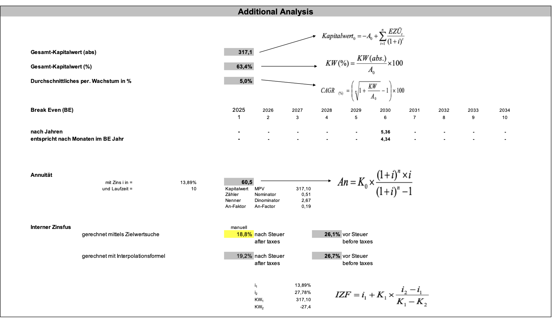 Auf Basis fundierter Berechnungen können Sie sofort erkennen, ob sich ein Investment rechnet und wie gut es sich rechnet. Der Vergleich mehrerer Alternativen erleichtert Ihnen die Entscheidungsfindung. Zudem werden Sie erkennen, wie eine Bank oder ein Investor diese bewertet und welche Anforderungen diese an Ihre Zahlen haben.
